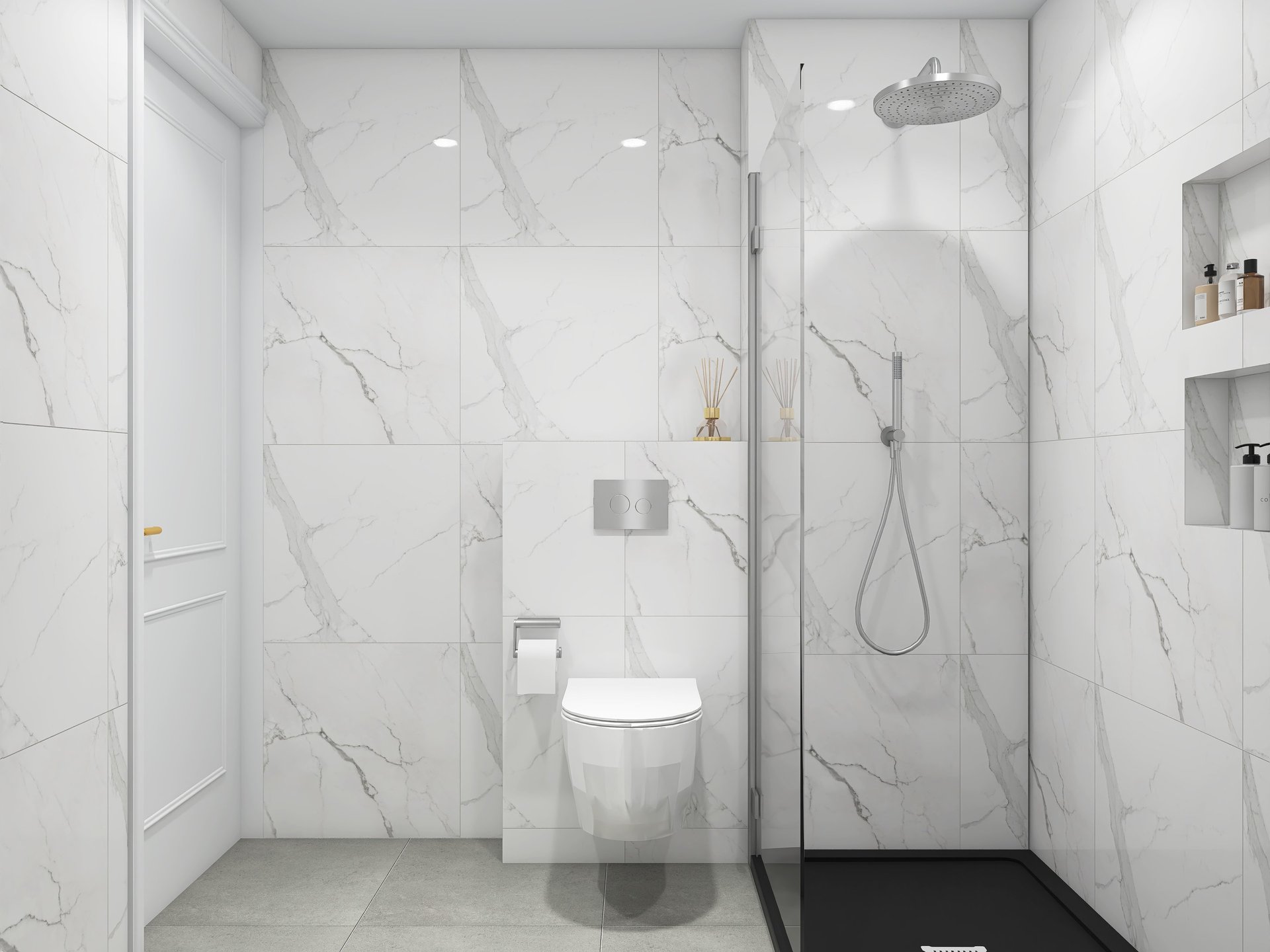 Contemporary bathroom with a walk in shower, white marble tiles, mitered edges, huge mirrors to widen a small space, and chrome accents.